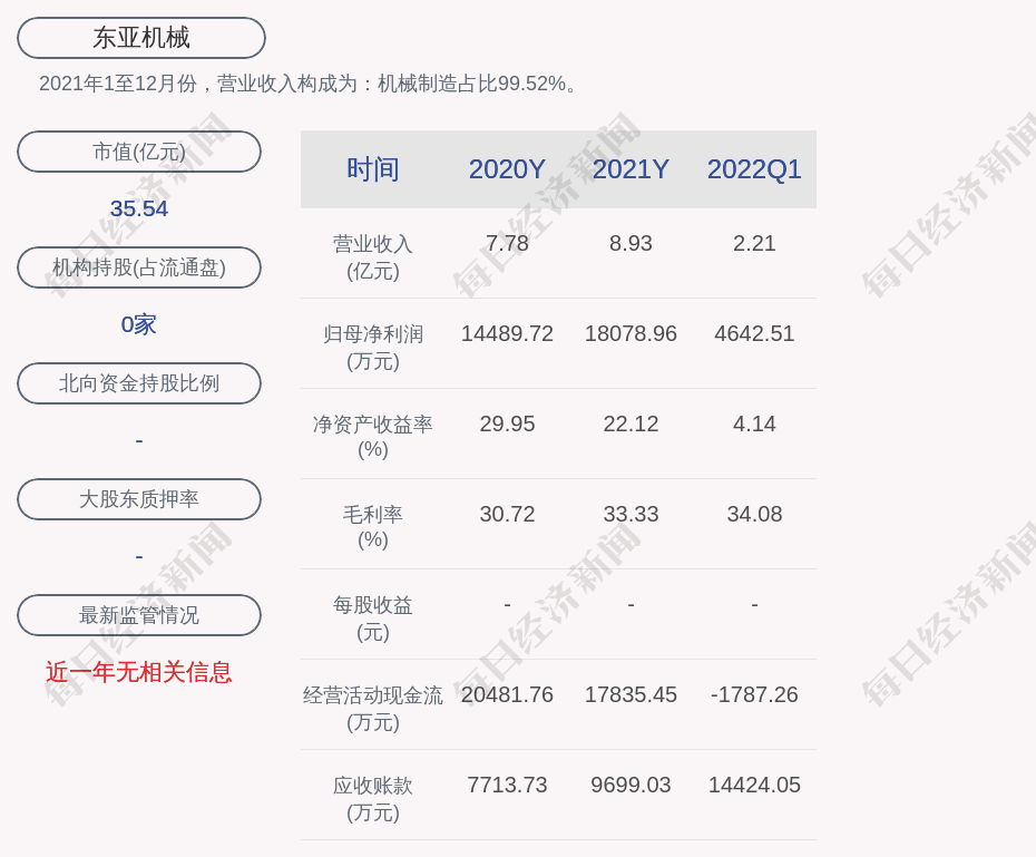 2021年1至12月份,东亚机械的营业收入构成为:机械制造占比99.52%。