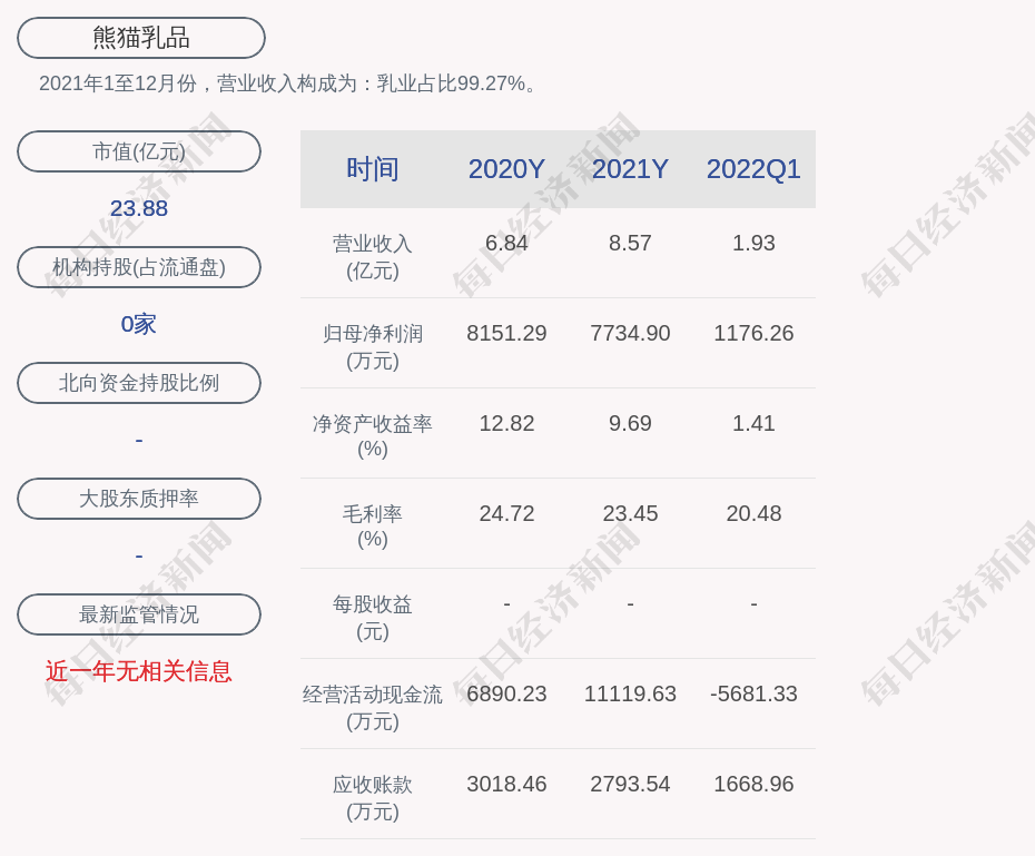 每经AI快讯,熊猫乳品(SZ 300898,收盘价:19.11元)4月25日晚间发布一季度业绩公告称,2022年第一季度营收约1.93亿元,同比减少1.76%;净利润约1176万元,同比减少19.21%;基本每股收益0.0941元,同比减少19.85%。