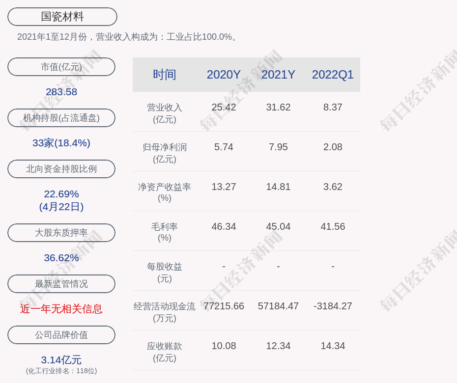 每经AI快讯,国瓷材料(SZ 300285,收盘价:28.25元)4月25日晚间发布一季度业绩公告称,2022年第一季度营收约8.37亿元,同比增加34.78%;净利润约2.08亿元,同比增加11.94%;基本每股收益0.21元,同比增加10.53%。