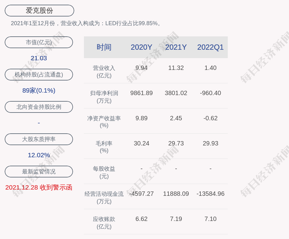 2021年1至12月份,爱克股份的营业收入构成为:LED行业占比99.85%。