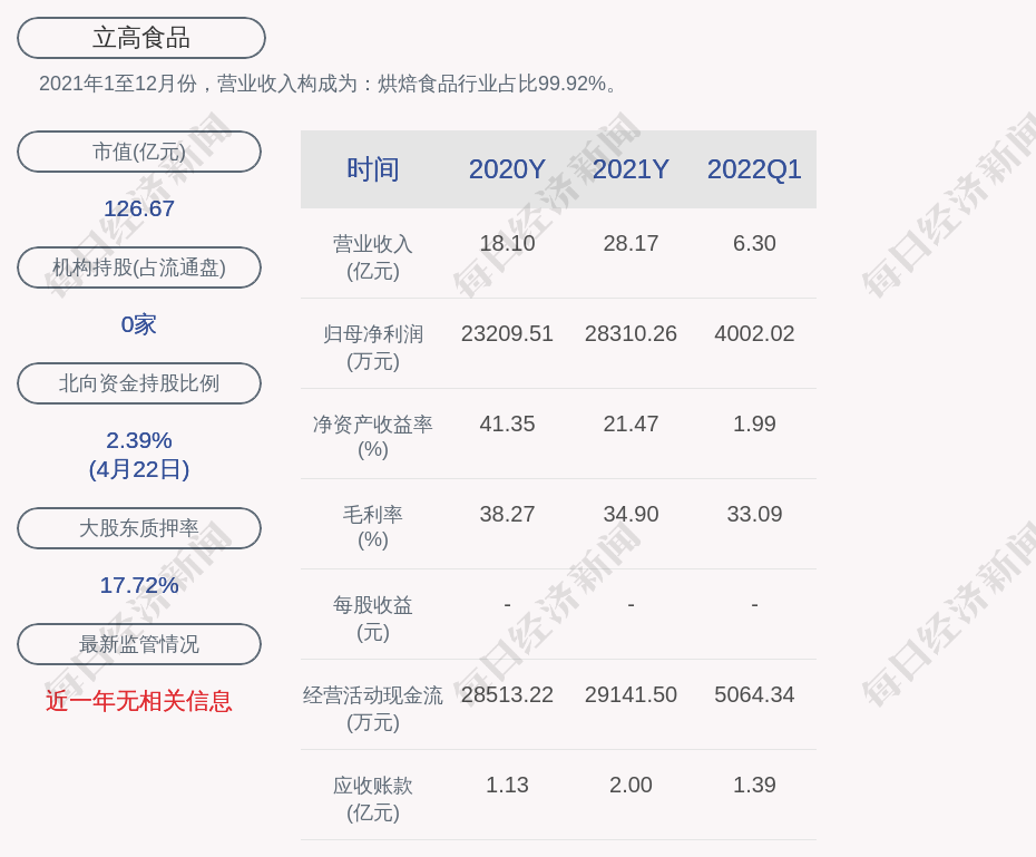 2021年1至12月份,立高食品的营业收入构成为:烘焙食品行业占比99.92%。