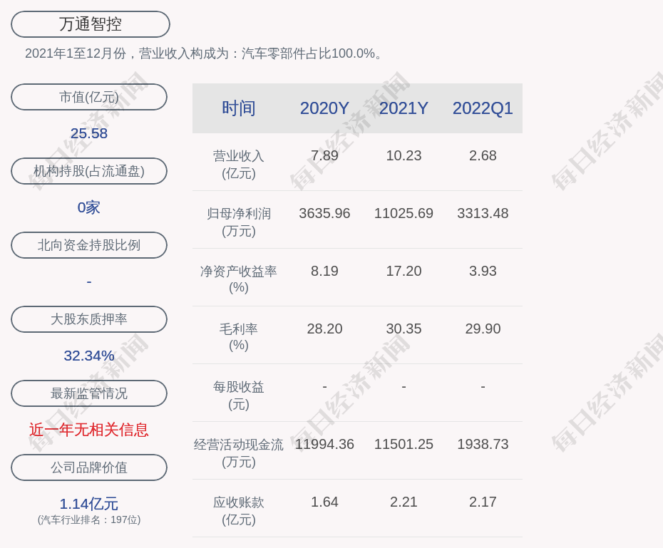 2021年1至12月份,万通智控的营业收入构成为:汽车零部件占比100.0%。