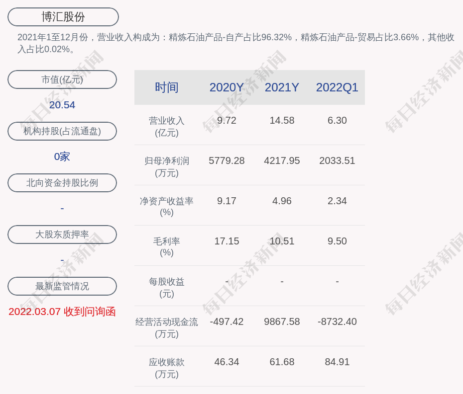 2021年1至12月份,博汇股份的营业收入构成为:精炼石油产品-自产占比96.32%,精炼石油产品-贸易占比3.66%,其他收入占比0.02%。