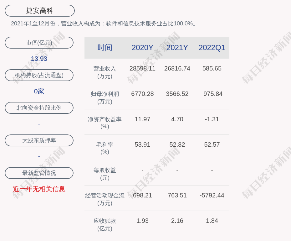 每经AI快讯,捷安高科(SZ 300845,收盘价:15.08元)4月26日发布年度业绩报告称,2021年营业收入约2.68亿元,同比减少6.23%;归属于上市公司股东的净利润约3567万元,同比减少47.32%;基本每股收益0.39元,同比减少53.57%。拟每10股派发现金红利3元(含税)、不送红股、以资本公积金向全体股东每10股转增2股。