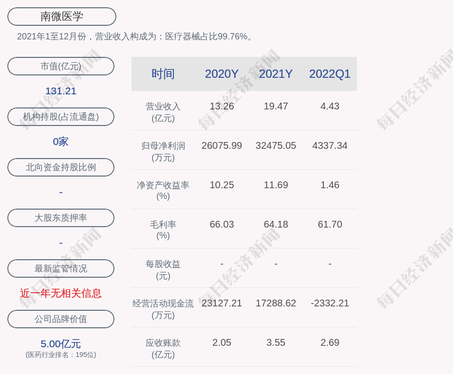 每经AI快讯,南微医学(SH 688029,收盘价:98.1元)4月26日发布一季度业绩公告称,2022年第一季度营收约4.43亿元;净利润约4337万元;基本每股收益0.3243元。