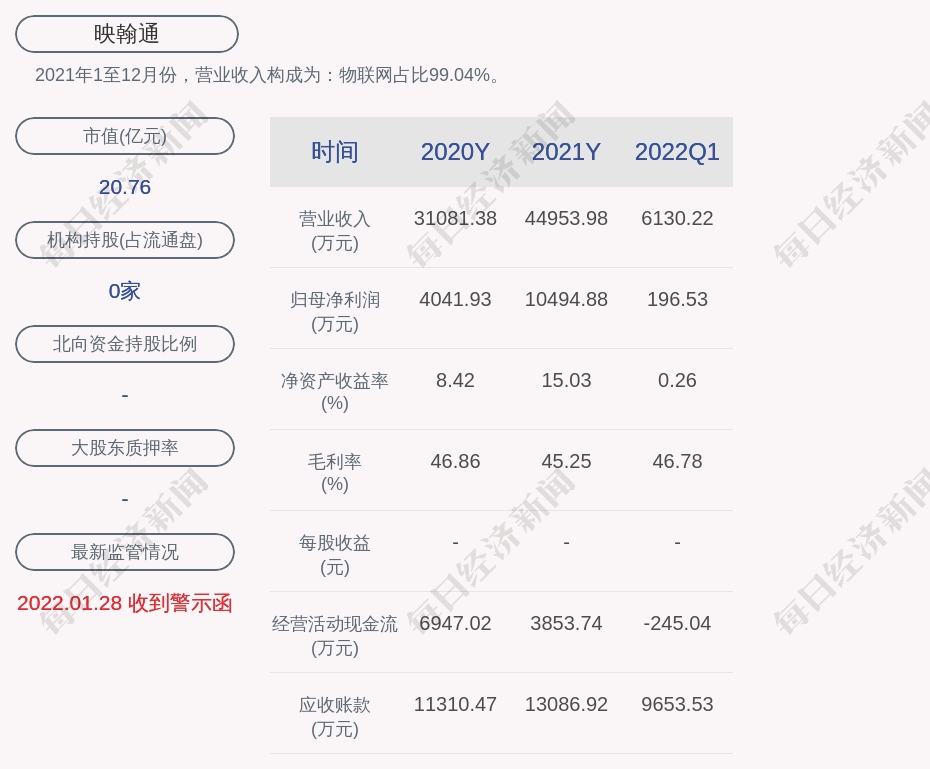 2021年1至12月份,映翰通的营业收入构成为:物联网占比99.04%。