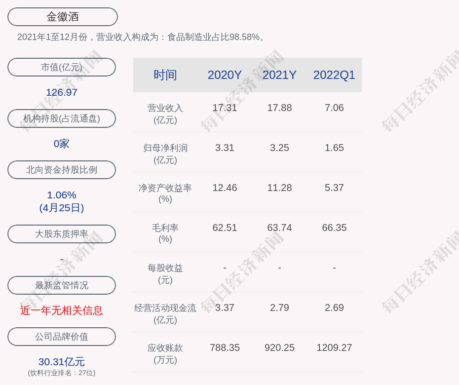 2021年1至12月份,金徽酒的营业收入构成为:食品制造业占比98.58%。