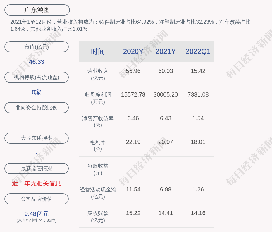 2021年1至12月份,广东鸿图的营业收入构成为:铸件制造业占比64.92%,注塑制造业占比32.23%,汽车改装占比1.84%,其他业务收入占比1.01%。