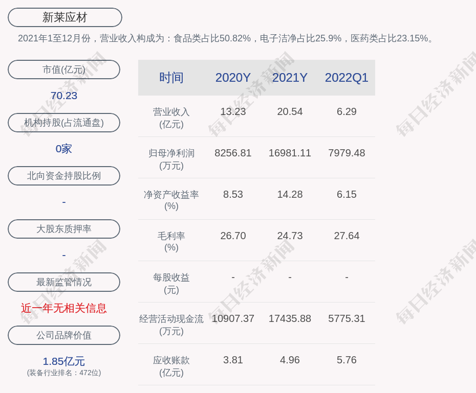 2021年1至12月份,新莱应材的营业收入构成为:食品类占比50.82%,电子洁净占比25.9%,医药类占比23.15%。