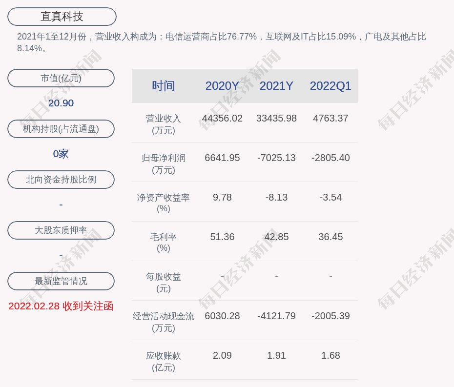 每经AI快讯,直真科技(SZ 003007,收盘价:20.1元)4月26日发布年度业绩报告称,2021年营业收入约3.34亿元,同比减少24.62%;归属于上市公司股东的净利润亏损约7025万元;基本每股收益亏损0.68元。拟不派现、不送红股、不转增。