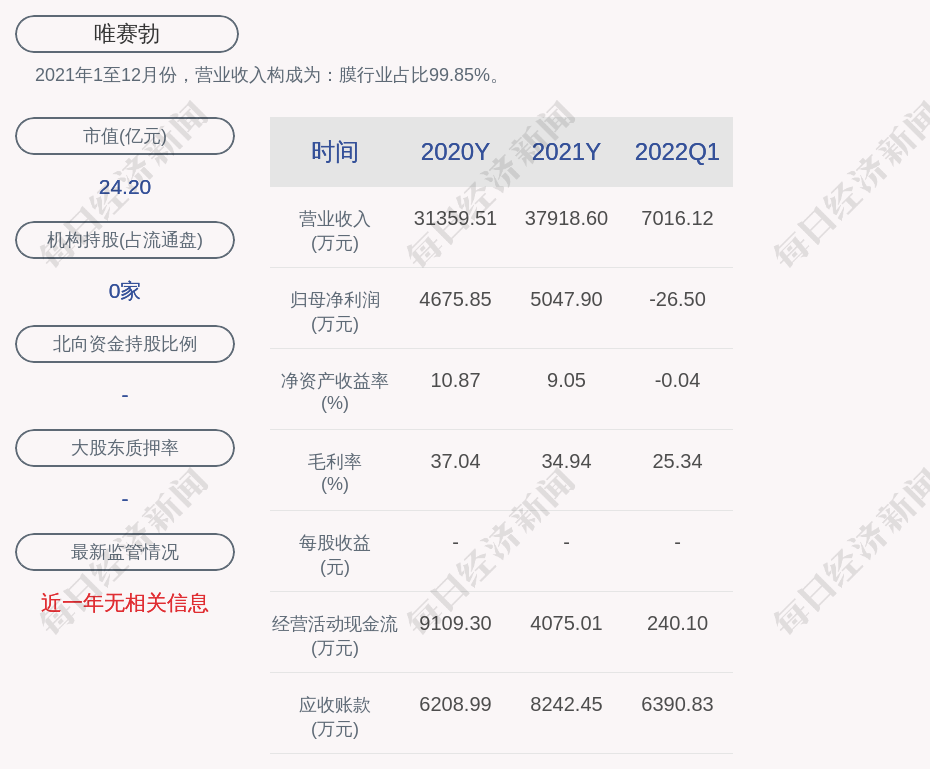 2021年1至12月份,唯赛勃的营业收入构成为:膜行业占比99.85%。