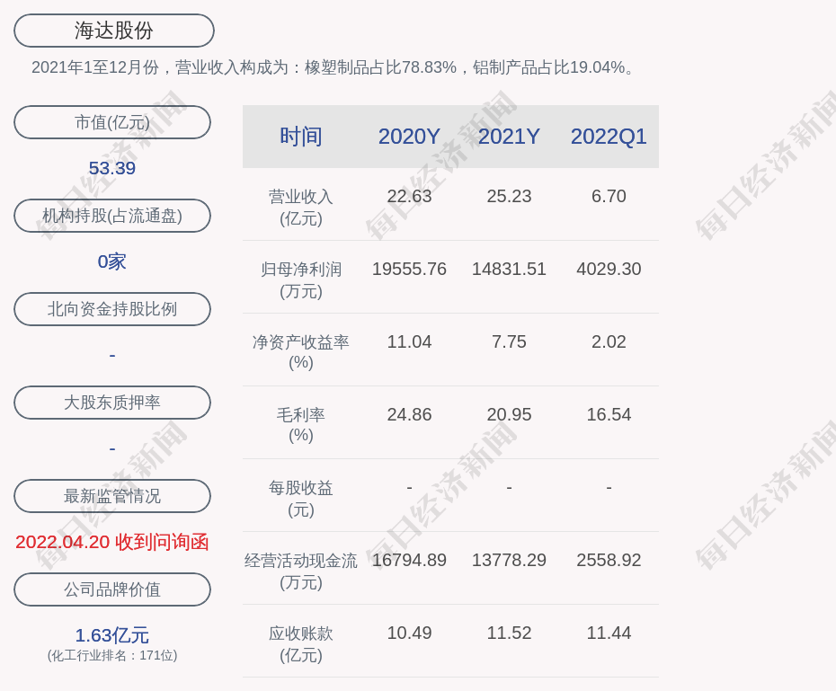 2021年1至12月份,海达股份的营业收入构成为:橡塑制品占比78.83%,铝制产品占比19.04%。