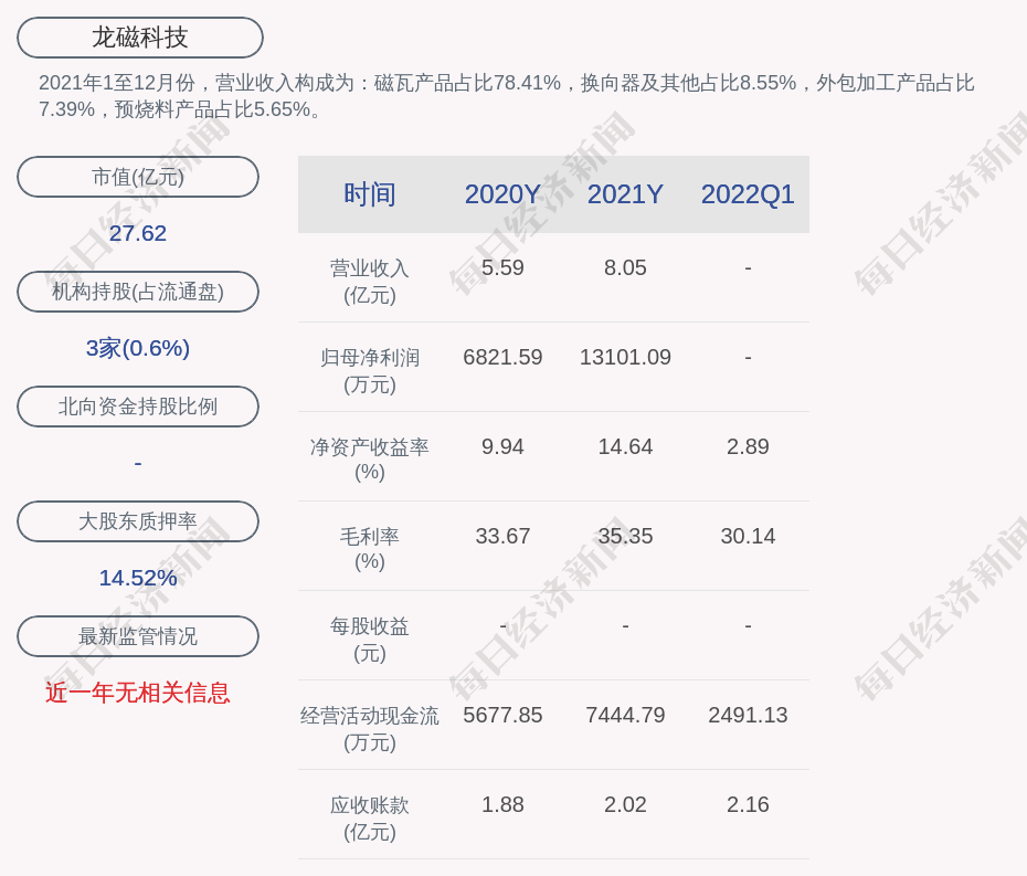 2021年1至12月份,龙磁科技的营业收入构成为:磁瓦产品占比78.41%,换向器及其他占比8.55%,外包加工产品占比7.39%,预烧料产品占比5.65%。