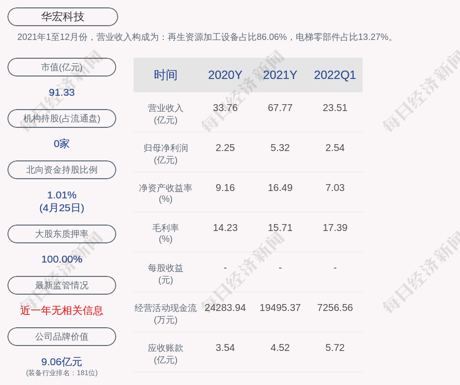 2021年1至12月份,华宏科技的营业收入构成为:再生资源加工设备占比86.06%,电梯零部件占比13.27%。