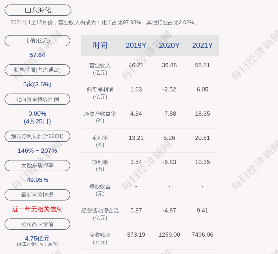 2021年1至12月份,山东海化的营业收入构成为:化工占比97.98%,其他行业占比2.02%。