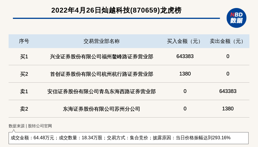 每经讯,2022年4月26日,新三板基础层公司灿越科技(870659)登上龙虎榜,交易方式是集合竞价,披露原因是当日价格振幅达到293.16%,成交数量18.34万股,成交金额64.48万元。买一席位为兴业证券股份有限公司福州鳌峰路证券营业部,买入64.34万元;卖一席位为安信证券股份有限公司青岛东海西路证券营业部,卖出64.34万元。