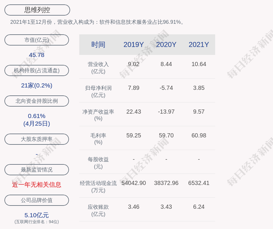 2021年1至12月份,思维列控的营业收入构成为:软件和信息技术服务业占比96.91%。