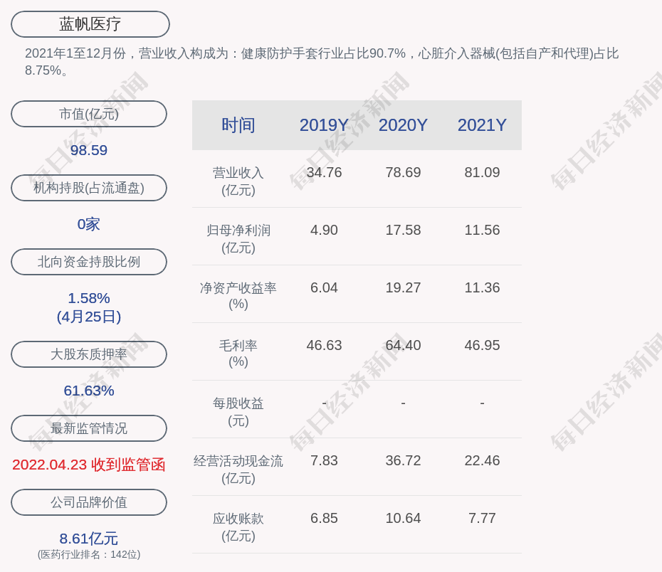 2021年1至12月份,蓝帆医疗的营业收入构成为:健康防护手套行业占比90.7%,心脏介入器械(包括自产和代理)占比8.75%。