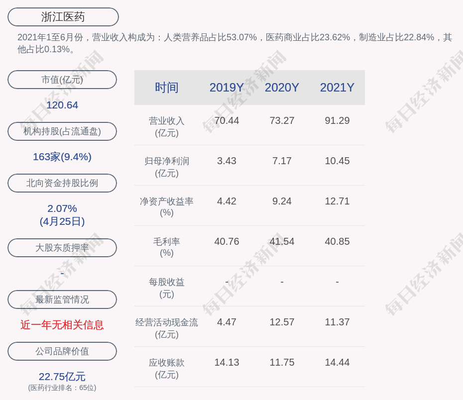 2021年1至6月份,浙江医药的营业收入构成为:人类营养品占比53.07%,医药商业占比23.62%,制造业占比22.84%,其他占比0.13%。