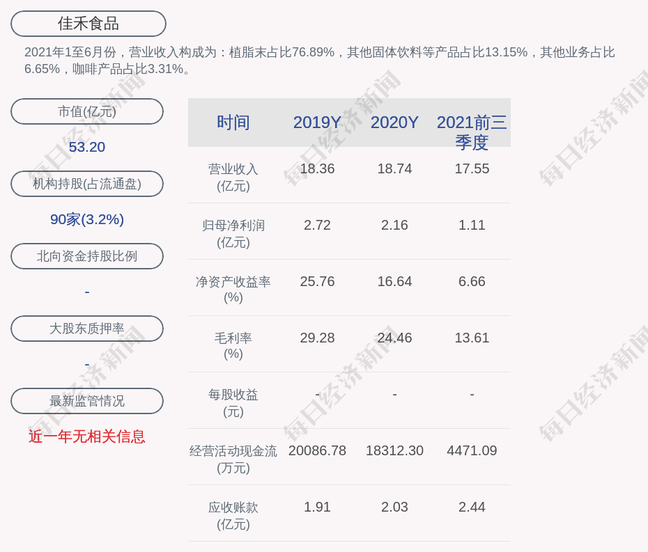 2021年1至6月份,佳禾食品的营业收入构成为:植脂末占比76.89%,其他固体饮料等产品占比13.15%,其他业务占比6.65%,咖啡产品占比3.31%。