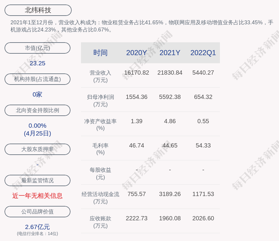 2021年1至12月份,北纬科技的营业收入构成为:物业租赁业务占比41.65%,物联网应用及移动增值业务占比33.45%,手机游戏占比24.23%,其他业务占比0.67%。