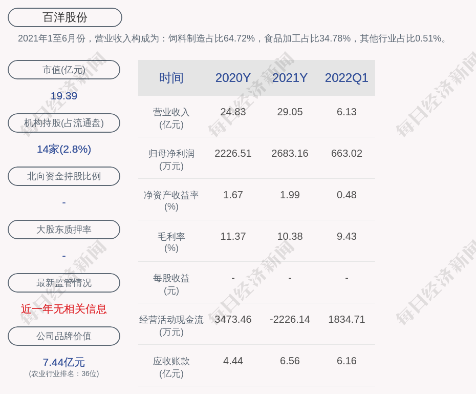 每经AI快讯,百洋股份(SZ 002696,收盘价:5.55元)4月26日晚间发布年度业绩报告称,2021年营业收入约29.05亿元,同比增加17.03%;归属于上市公司股东的净利润约2683万元,同比增加20.51%;基本每股收益0.08元,同比增加33.33%。拟不派现、不送红股、不转增。