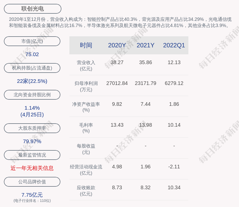 2020年1至12月份,联创光电的营业收入构成为:智能控制产品占比40.3%,背光源及应用产品占比34.29%,光电通信缆和智能装备缆及金属材料占比16.7%,半导体激光系列及航天微电子元器件占比4.81%,其他业务占比3.9%。