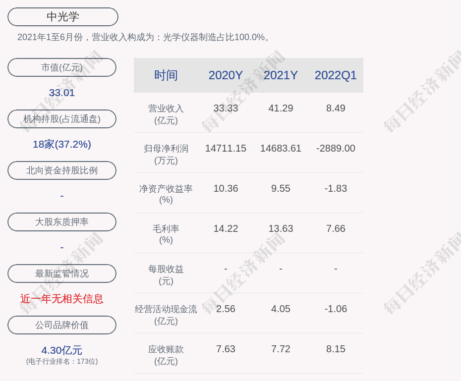2021年1至6月份,中光学的营业收入构成为:光学仪器制造占比100.0%。