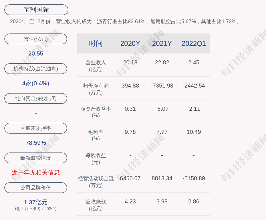 2020年1至12月份,宝利国际的营业收入构成为:沥青行业占比92.61%,通用航空占比5.67%,其他占比1.72%。