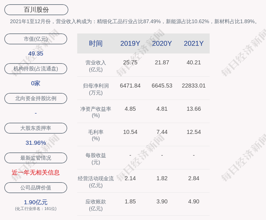2021年1至12月份,百川股份的营业收入构成为:精细化工品行业占比87.49%,新能源占比10.62%,新材料占比1.89%。