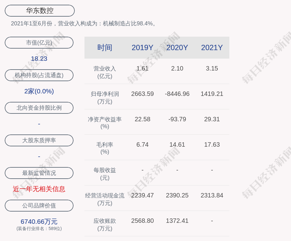 2021年1至6月份,华东数控的营业收入构成为:机械制造占比98.4%。
