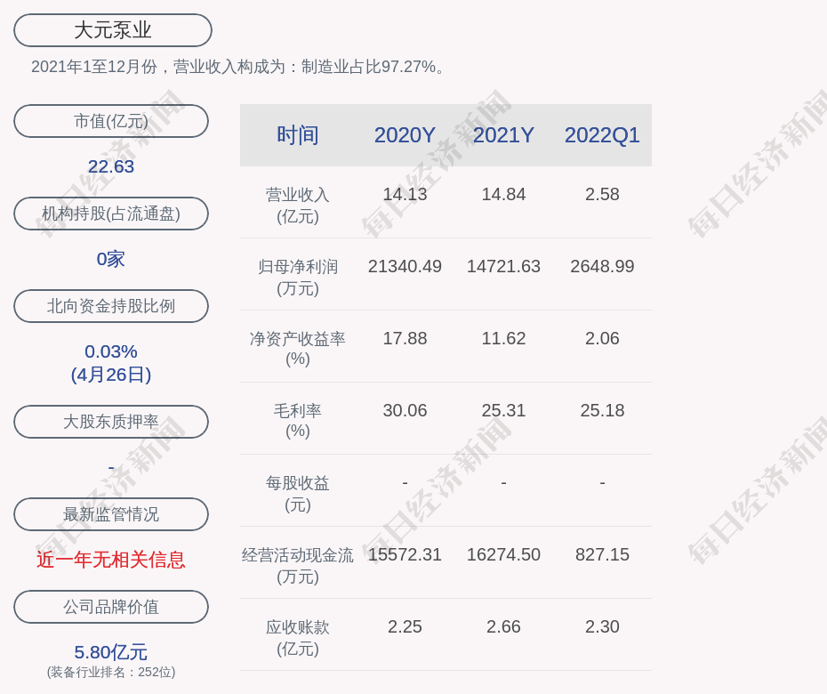 每经AI快讯,大元泵业(SH 603757,收盘价:13.45元)4月27日晚间发布一季度业绩公告称,2022年第一季度营收约2.58亿元;净利润约2649万元;基本每股收益0.16元。