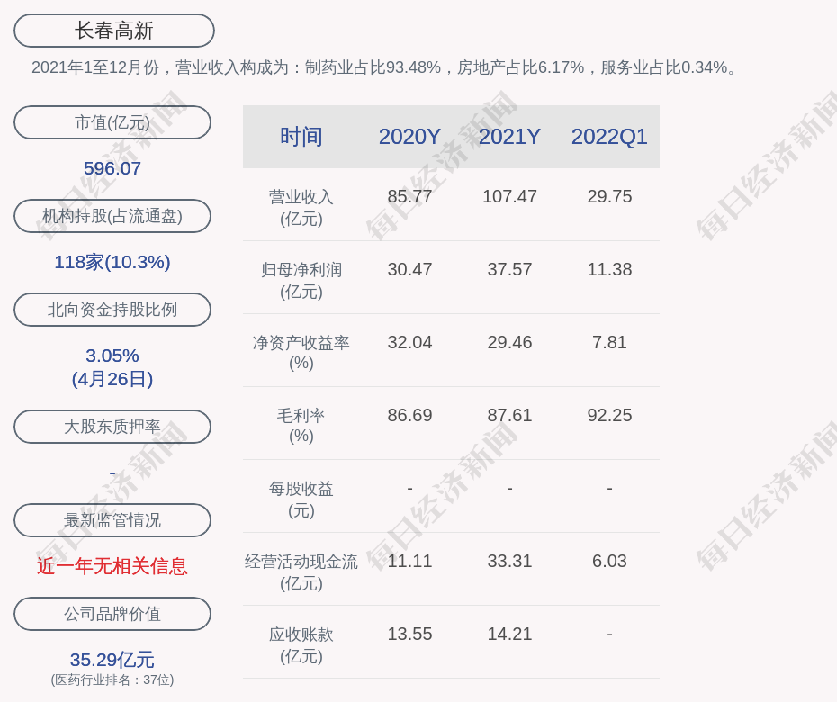 每经AI快讯,长春高新(SZ 000661,收盘价:147.28元)4月27日晚间发布一季度业绩公告称,2022年第一季度营收约29.75亿元,同比增加30.4%;净利润约11.38亿元,同比增加30.16%;基本每股收益2.83元,同比增加31.02%。