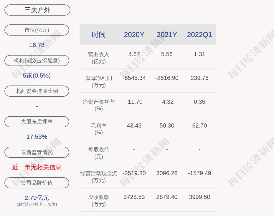每经AI快讯,三夫户外(SZ 002780,收盘价:10.65元)4月27日晚间发布一季度业绩公告称,2022年第一季度营收约1.31亿元,同比增加1.93%;净利润约240万元,同比增加8.92%;基本每股收益0.02元,同比增加0%。