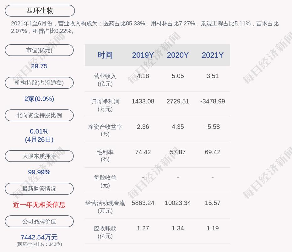 2021年1至6月份,四环生物的营业收入构成为:医药占比85.33%,用材林占比7.27%,景观工程占比5.11%,苗木占比2.07%,租赁占比0.22%。