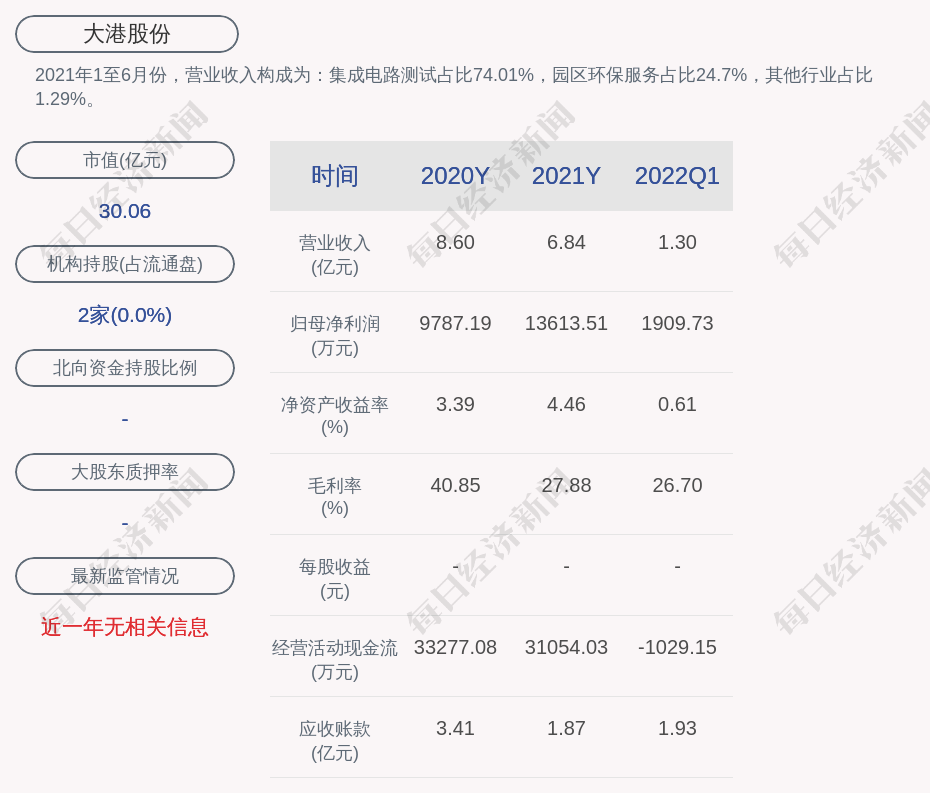 2021年1至6月份,大港股份的营业收入构成为:集成电路测试占比74.01%,园区环保服务占比24.7%,其他行业占比1.29%。