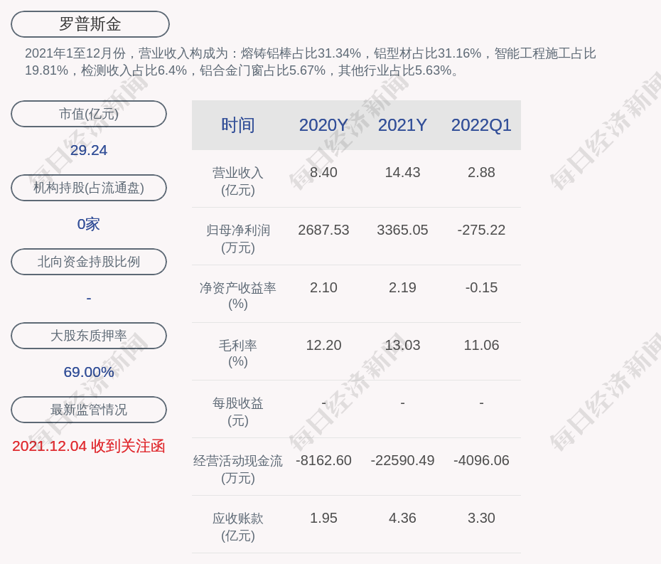 2021年1至12月份,罗普斯金的营业收入构成为:熔铸铝棒占比31.34%,铝型材占比31.16%,智能工程施工占比19.81%,检测收入占比6.4%,铝合金门窗占比5.67%,其他行业占比5.63%。