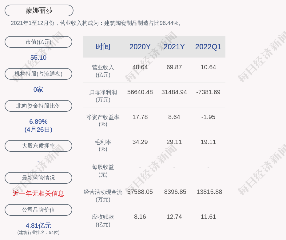 每经AI快讯,蒙娜丽莎(SZ 002918,收盘价:13.16元)4月27日晚间发布一季度业绩公告称,2022年第一季度营收约10.64亿元,同比增加6.74%;亏损约7382万元;基本每股亏损0.18元。