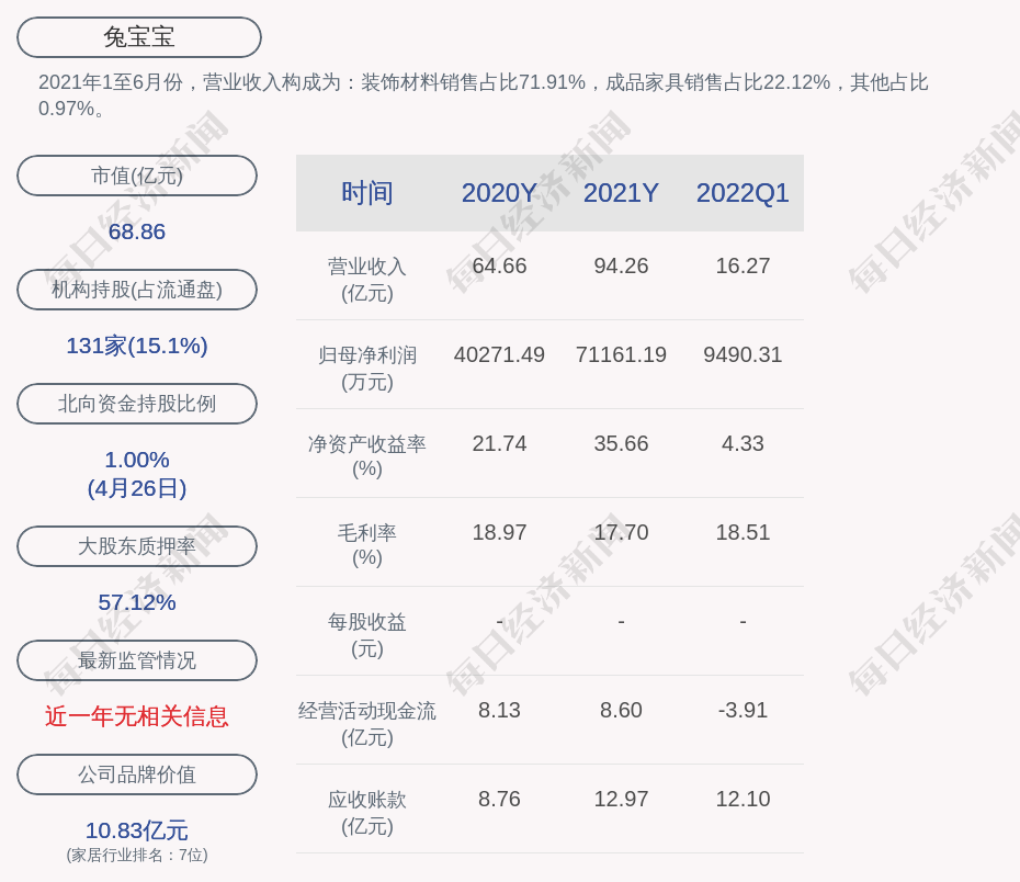 2021年1至6月份,兔宝宝的营业收入构成为:装饰材料销售占比71.91%,成品家具销售占比22.12%,其他占比0.97%。