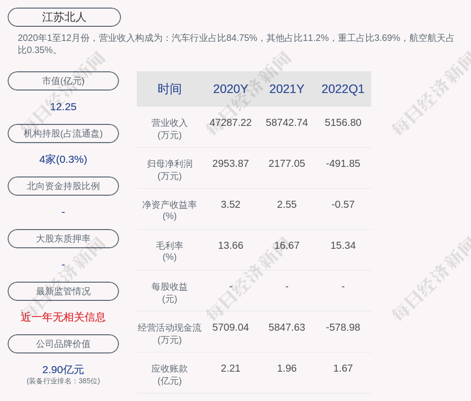 2020年1至12月份,江苏北人的营业收入构成为:汽车行业占比84.75%,其他占比11.2%,重工占比3.69%,航空航天占比0.35%。
