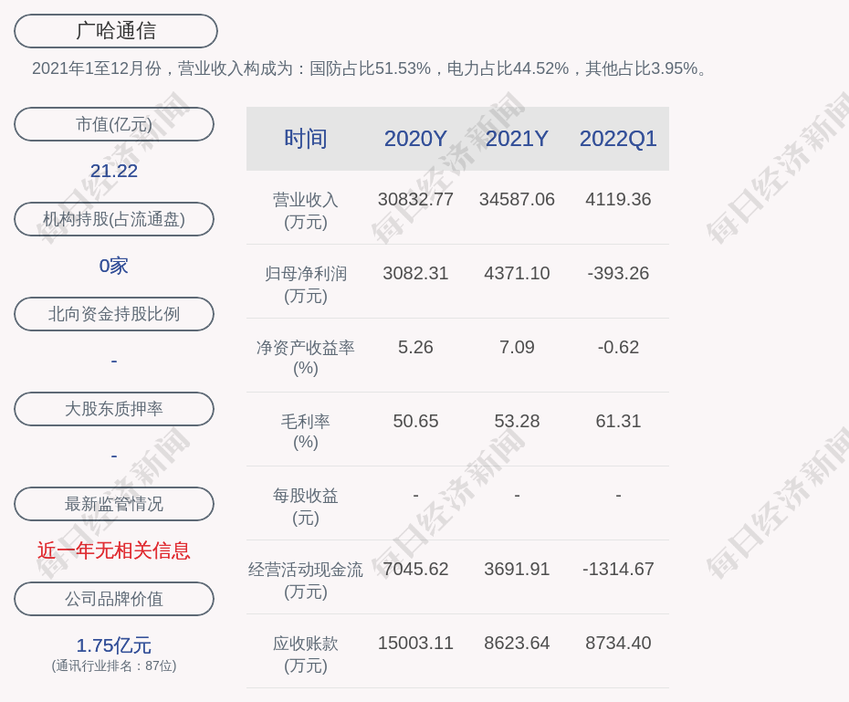 2021年1至12月份,广哈通信的营业收入构成为:国防占比51.53%,电力占比44.52%,其他占比3.95%。