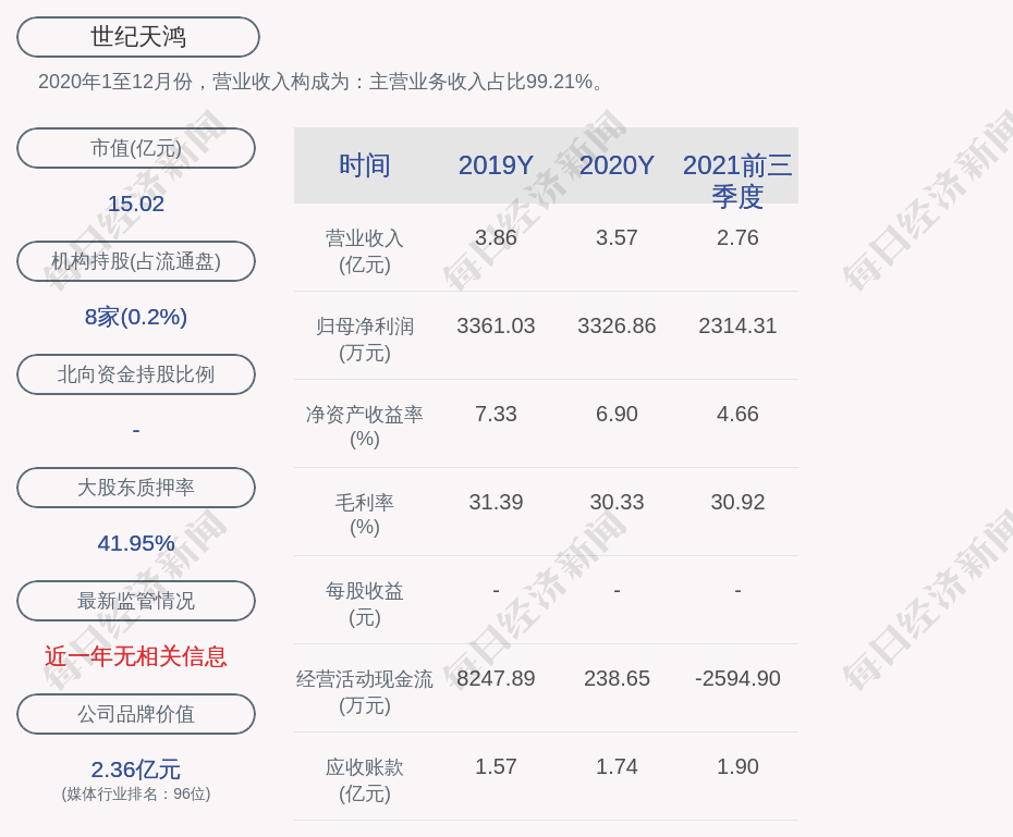 2020年1至12月份,世纪天鸿的营业收入构成为:主营业务收入占比99.21%。