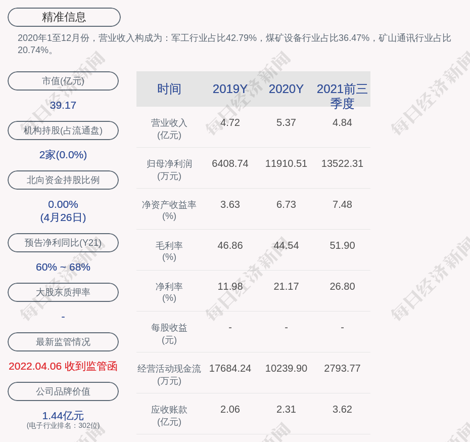 2020年1至12月份,精准信息的营业收入构成为:军工行业占比42.79%,煤矿设备行业占比36.47%,矿山通讯行业占比20.74%。