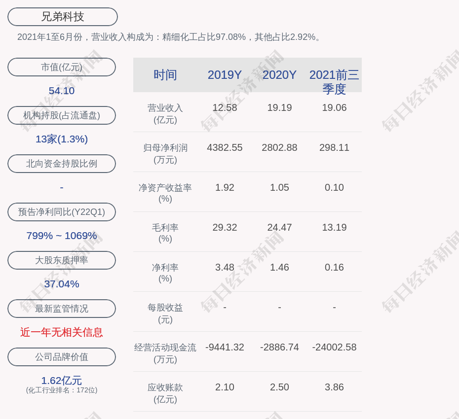 2021年1至6月份,兄弟科技的营业收入构成为:精细化工占比97.08%,其他占比2.92%。