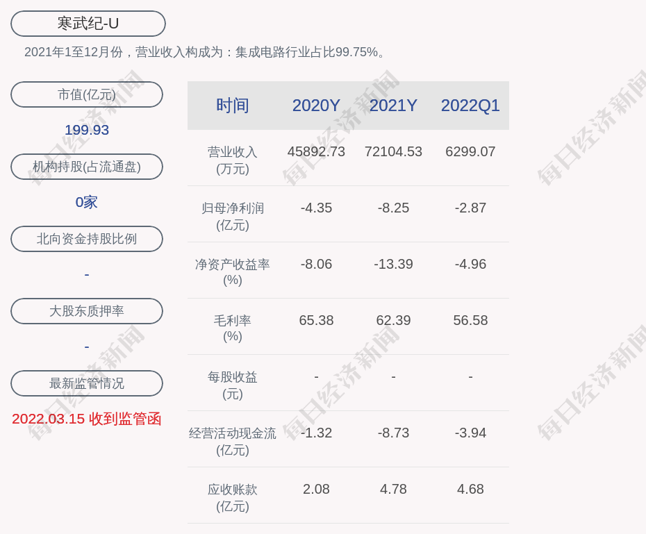 2021年1至12月份,寒武纪的营业收入构成为:集成电路行业占比99.75%。