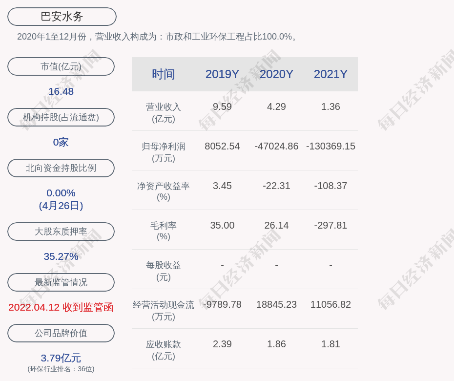 每经AI快讯,巴安水务(SZ 300262,收盘价:2.46元)4月27日晚间发布年度业绩报告称,2021年营业收入约1.36亿元,同比减少68.25%;归属于上市公司股东的净利润亏损约13.04亿元;基本每股收益亏损1.95元。拟不派现、不送红股、不转增。