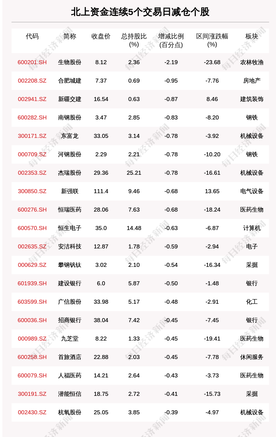 每经AI快讯,4月27日,北上资金连续5个交易日卖出50个股。北上资金连续5个交易日减仓个股中,生物股份(600201.SH,收盘价:8.12元)减持比例增幅最大,5个交易日减持2.19百分点,其他跌幅较大的个股包括合肥城建(002208.SZ,收盘价:7.37元)、新疆交建(002941.SZ,收盘价:16.54元)、南钢股份(600282.SH,收盘价:3.47元),分别减持0.95个百分点、0.87个百分点、0.83个百分点。