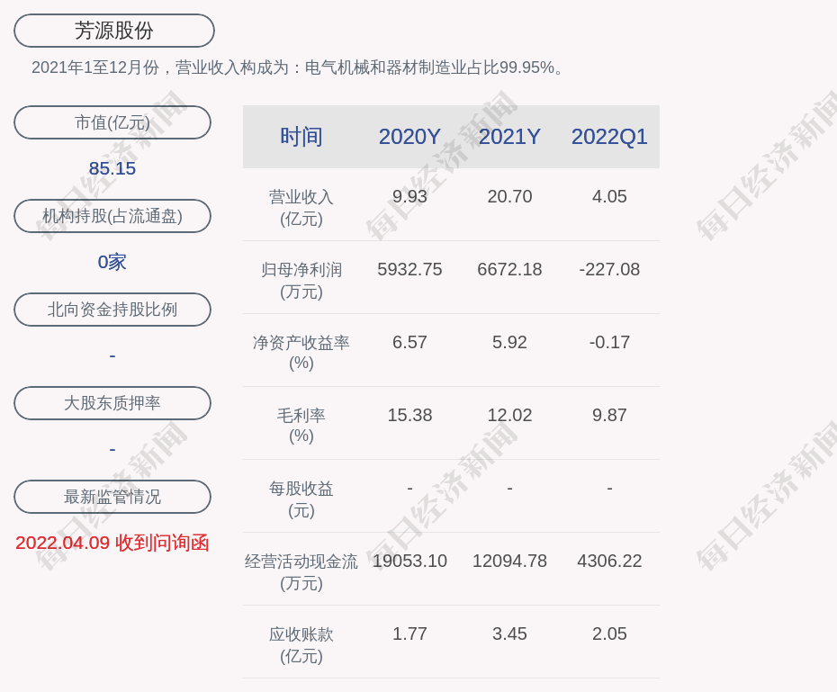 每经AI快讯,芳源股份(SH 688148,收盘价:16.64元)4月28日早间发布一季度业绩公告称,2022年第一季度营收约4.05亿元;净利润亏损约227万元。