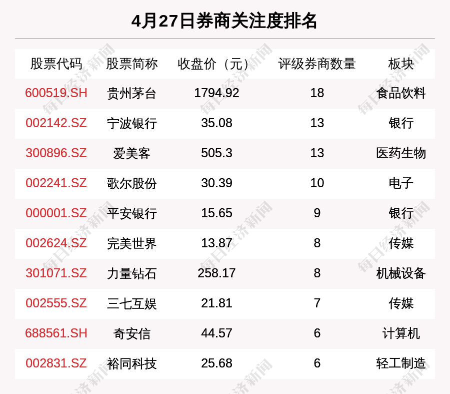从券商对个股的关注程度来看,有119只个股获得多家券商关注,券商关注数量排名居前的个股是贵州茅台(600519.SH)、宁波银行(002142.SZ)、爱美客(300896.SZ)。