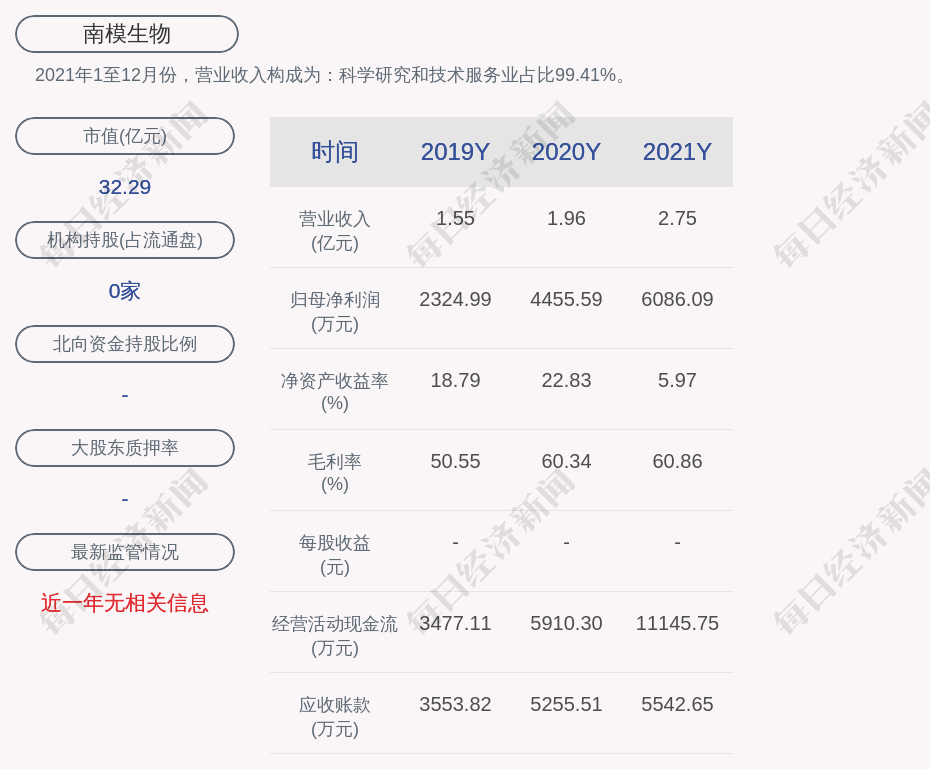 2021年1至12月份,南模生物的营业收入构成为:科学研究和技术服务业占比99.41%。